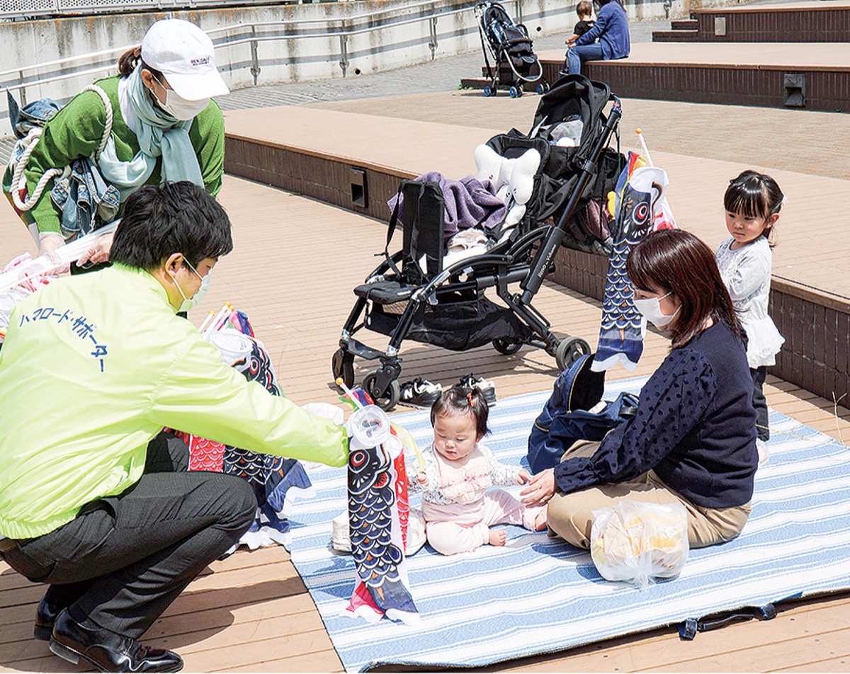 感染症対策のため、鯉のぼりも事前に消毒。配布の際にはメンバーらが手袋をつけ、受け取る人にも手指消毒の協力を求めるほどの徹底ぶり。同会のメンバーが広場を利用する親子に声をかけると、子どもたちが次々と鯉のぼりを手に取っていた。中には孫へあげようと、シニア世代の人も手に取っていた。