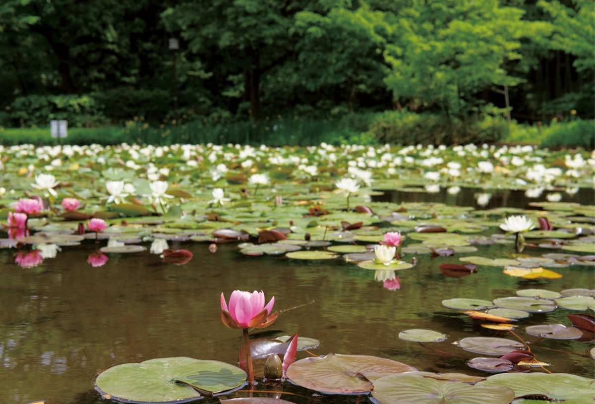 せせらぎ公園には自然林に囲まれた大きな池があり、水鳥や水辺の植物を観賞することができる。例年、6月頃からスイレンが見ごろを迎えるという。