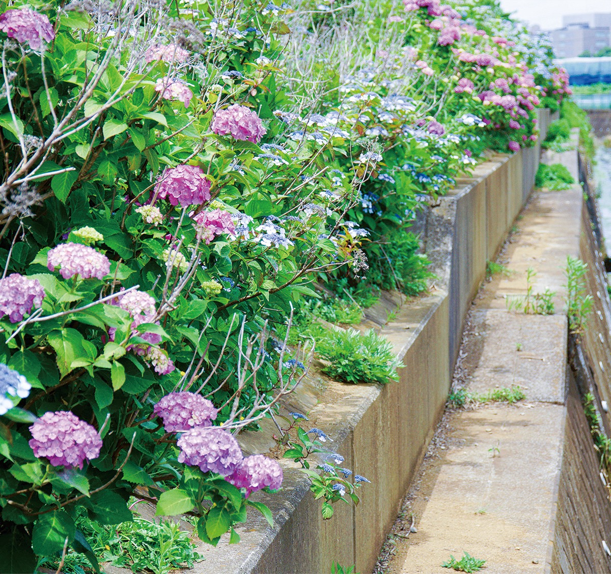 あじさいが咲いているのは東方町の大熊川沿い(JA横浜きた総合センターの北側)。新道下橋から堀込橋までの一部区間が「都筑区水と緑の散策マップ」のコースにも指定されている。