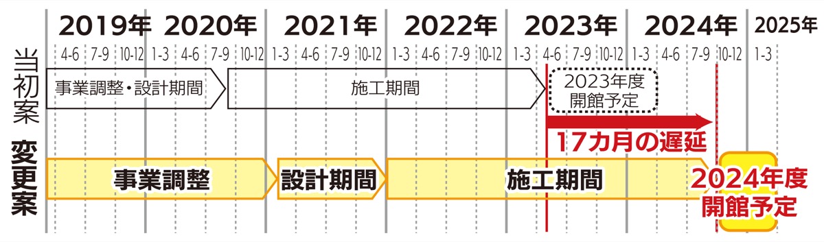 当初案では20年9月に現地での施工を開始し、23年4月までに整備した区民文化センターを横浜市に引き渡す予定だったが、変更案では22年1月に施工を開始し、24年9月までに引き渡し、24年度中に開館するスケジュールとなった。