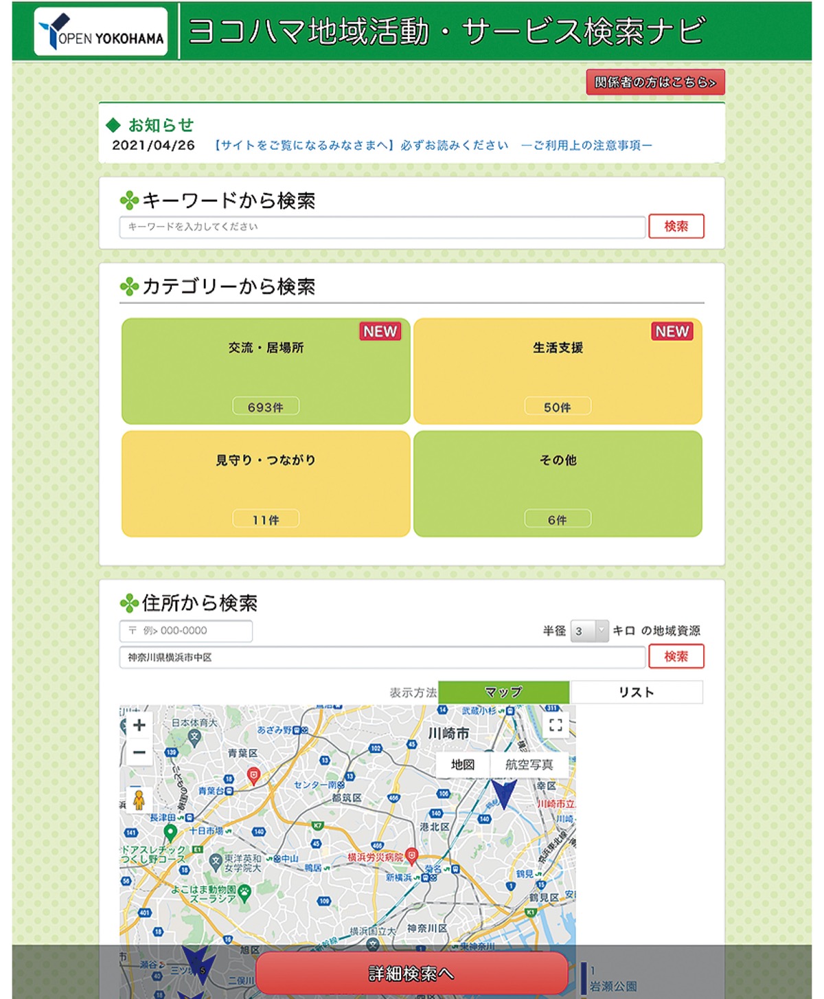 地域活動に参加したいけど、地元ではどんな団体が活動しているの--。こんな市民の要望に応えようと、横浜市はこのほど、インターネットで活動を検索できる「ヨコハマ地域活動・サービス検索ナビ」を立ち上げた。5月12日から先駆けて都筑区、緑区、鶴見区、瀬谷区の4区で先行的に運用されている。