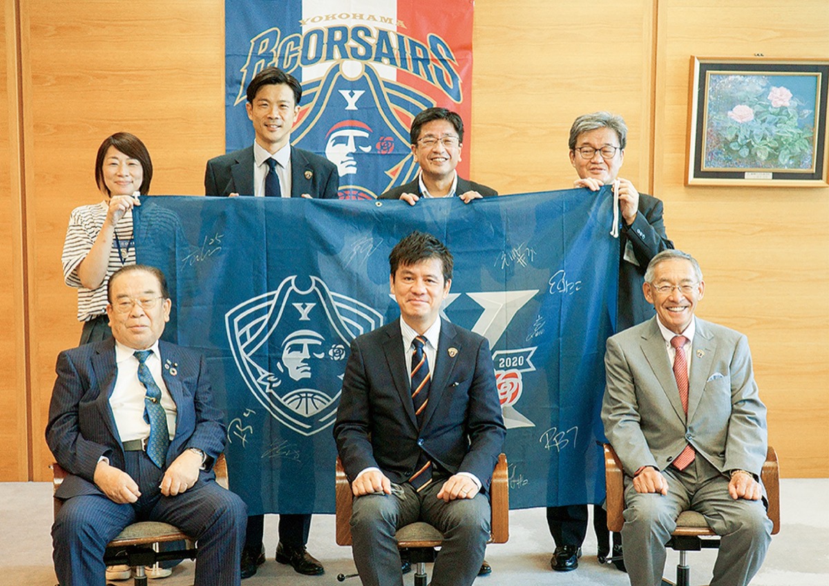 プロバスケットボールB1の横浜ビー・コルセアーズの植田哲也社長と竹田謙選手らが6月25日、都筑区役所を訪れ、佐藤友也区長らにシーズン終了報告をした。