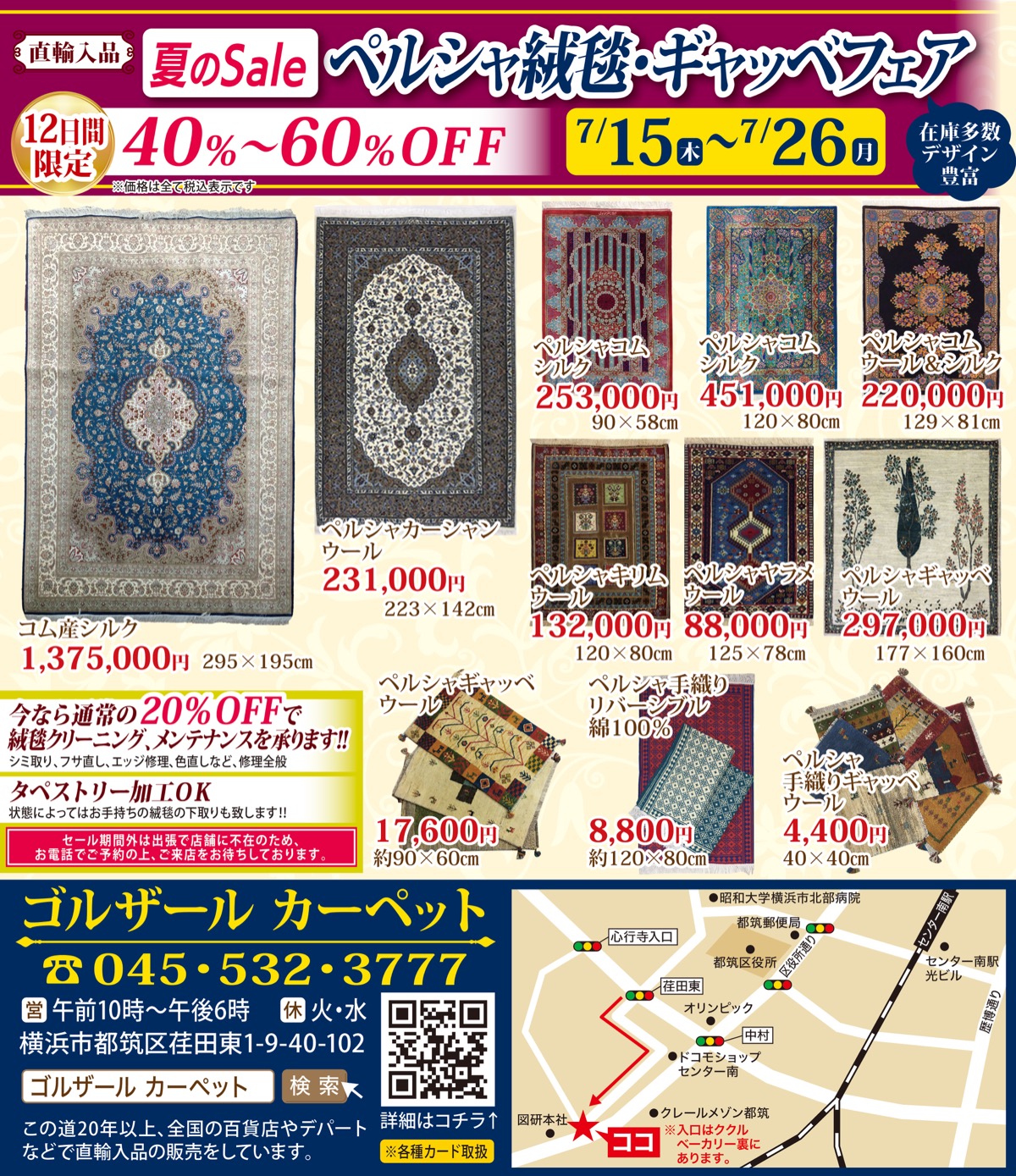 直輸入のお買い得品が続々と登場--。本紙でおなじみ、都筑区荏田東の「ゴルザール カーペット」ではきょう7月15日(木)から7月26日(月)までの12日間限定で「サマーセール」を実施する。ペルシャ絨毯やギャッベがずらり。今年の新作から、定番の人気商品、在庫の目玉商品などが大幅のお値引き価格で出品されるから見逃せない。