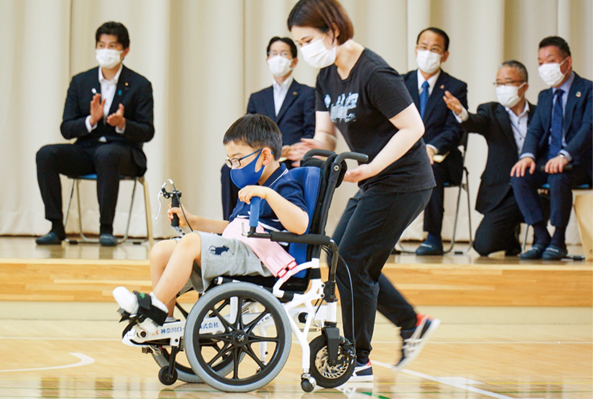同社の新谷修常務は「当社は小さな親切心というコンセプトで活動に取り組んでいる。この車いすを使って元気に明るく成長することを願っています」などと話した。