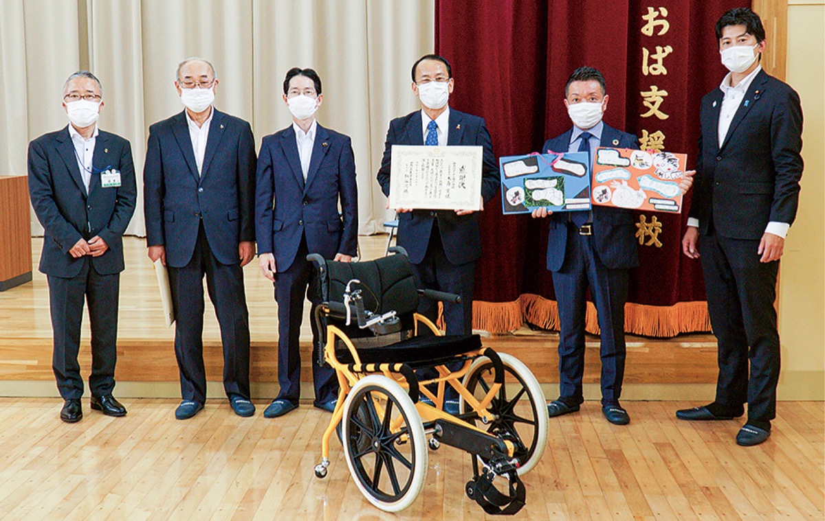 この日の式典には同校小学部の児童約20人と教員、同社役員、桐谷次郎県教育長、三谷英弘衆議院議員、敷田博昭県議が参加。子どもたちや保護者にとって待ち望んでいた車いすを前に会場の体育館はお祝いムードに包まれた。