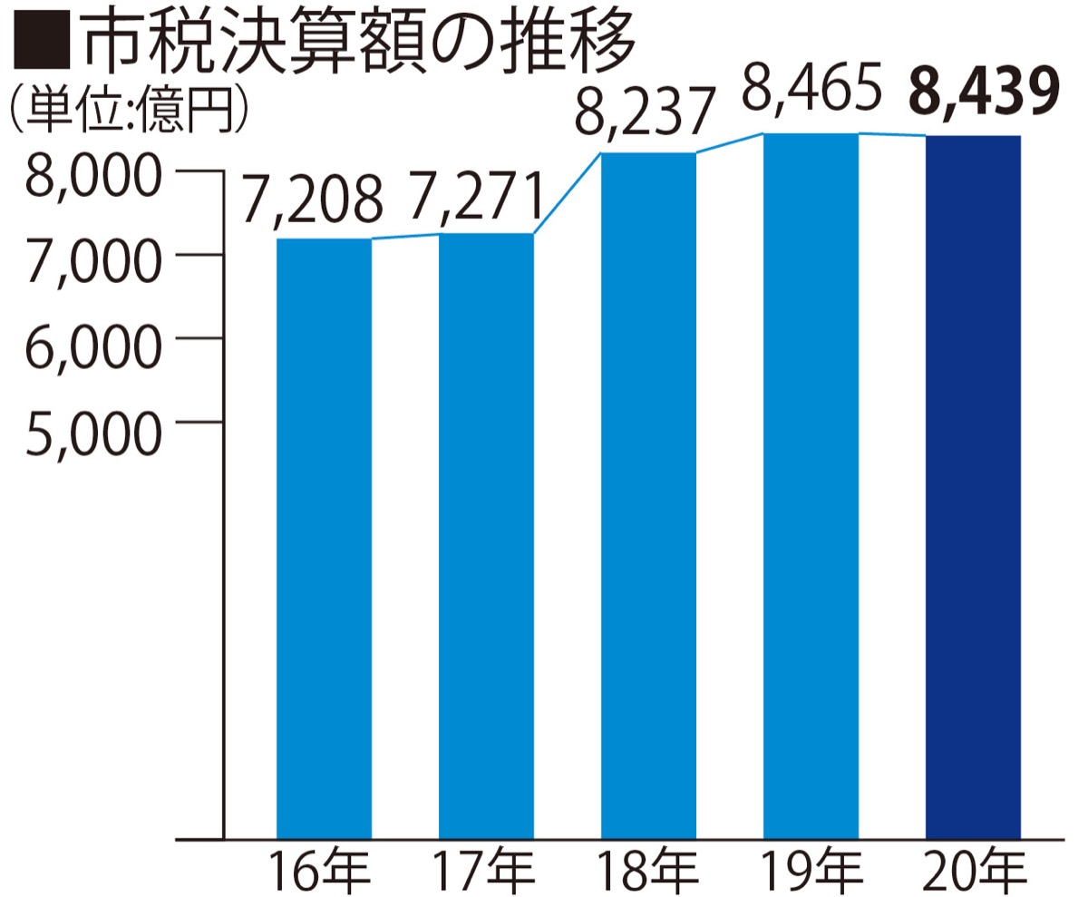 一方、法人市民税は19年度と比べて104億円減の483億円。企業の収益が落ち込んだほか、消費増税に合わせた税制改正の影響が大きく、新型コロナウイルスの影響は限定的だったと見られる。