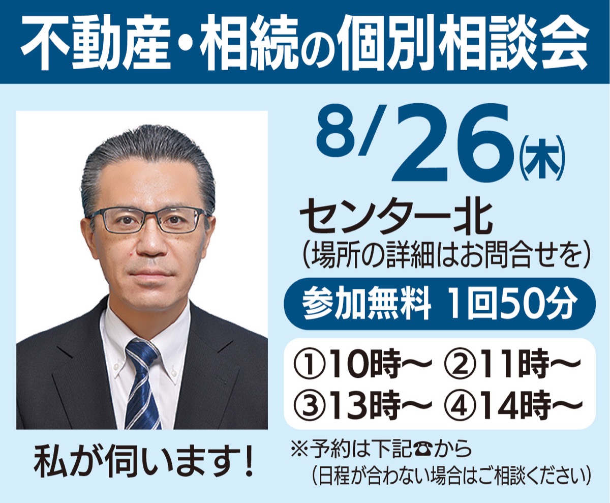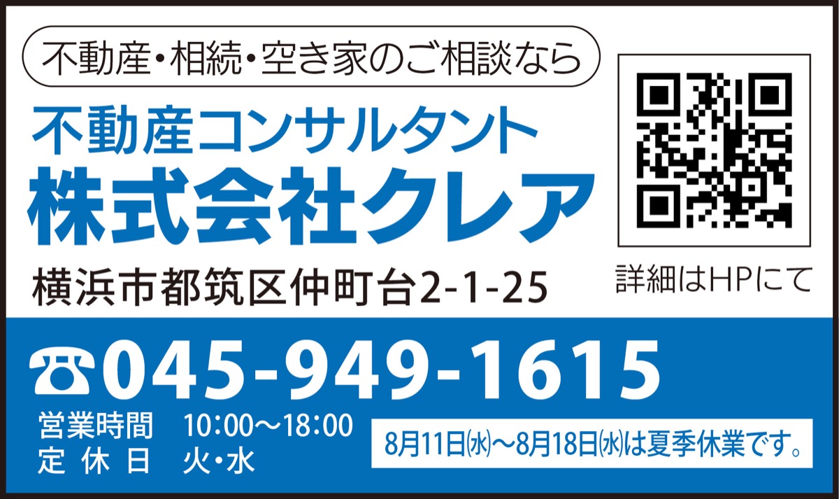 都筑区で15年以上、不動産や相続のお悩みを解決してきた不動産コンサルタントの株式会社クレアでは8月26日(木)にセンター北で「不動産・相続の相談会」を開催する。