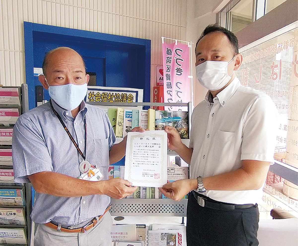 今回は同支部で行われている賞与授与式に募金箱を設置して従業員から集まった分を寄付に充てたという。この日は同支部の関谷直之さんが訪れ、同協議会の半田博之事務局長に手渡した=写真。