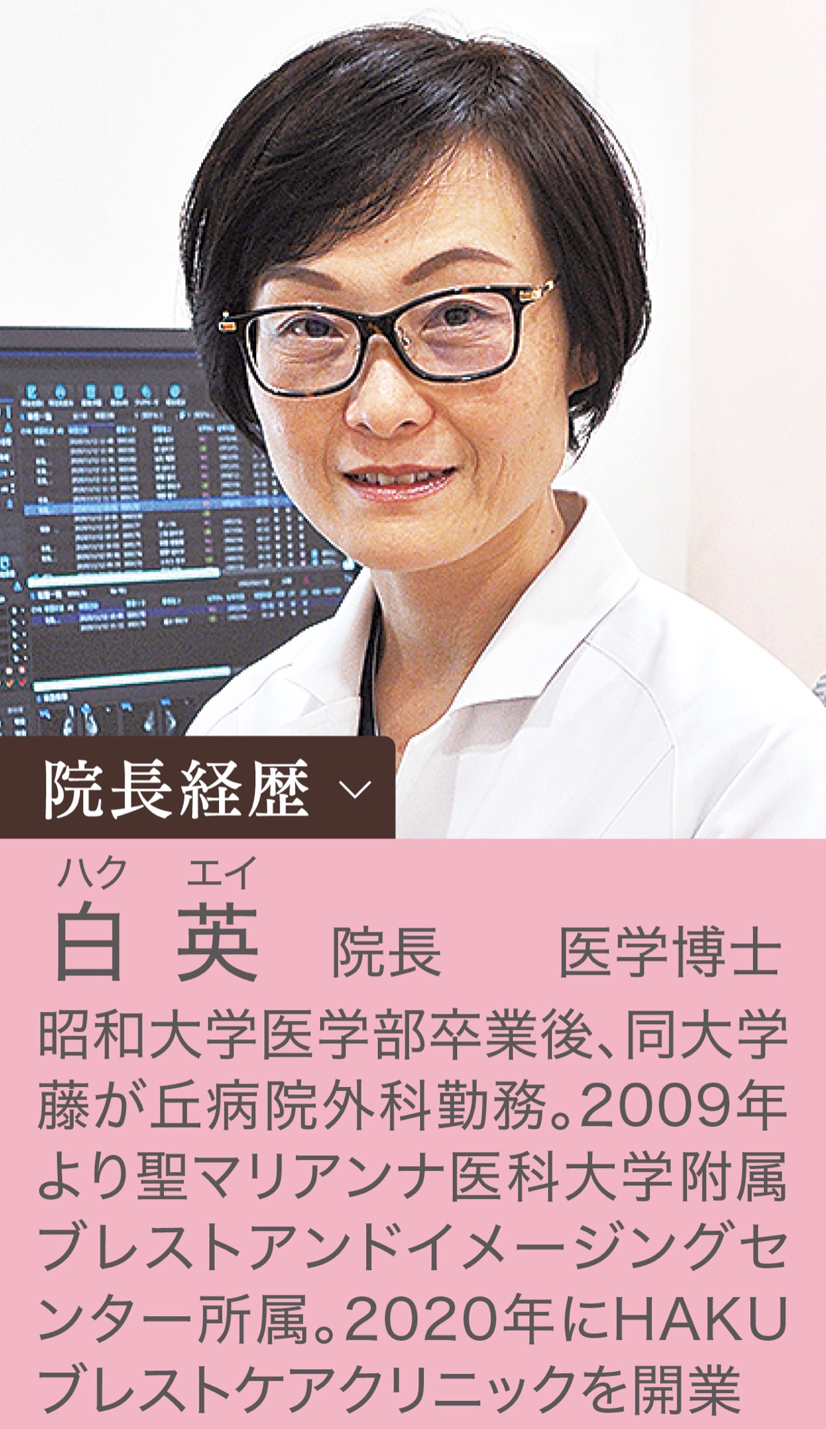 「乳がんは早期発見と適切な治療で他のがんに比べて治しやすいとされています。どの年代の女性であっても、早期発見のために定期的な検診とセルフチェックが重要」と話すのは白院長。大学病院や関連病院での経験を経て昨年の11月に乳腺専門クリニックを開業した。現在も週に一度聖マリアンナ医科大のブレストセンターで外来を担当しながら研鑽を積む。