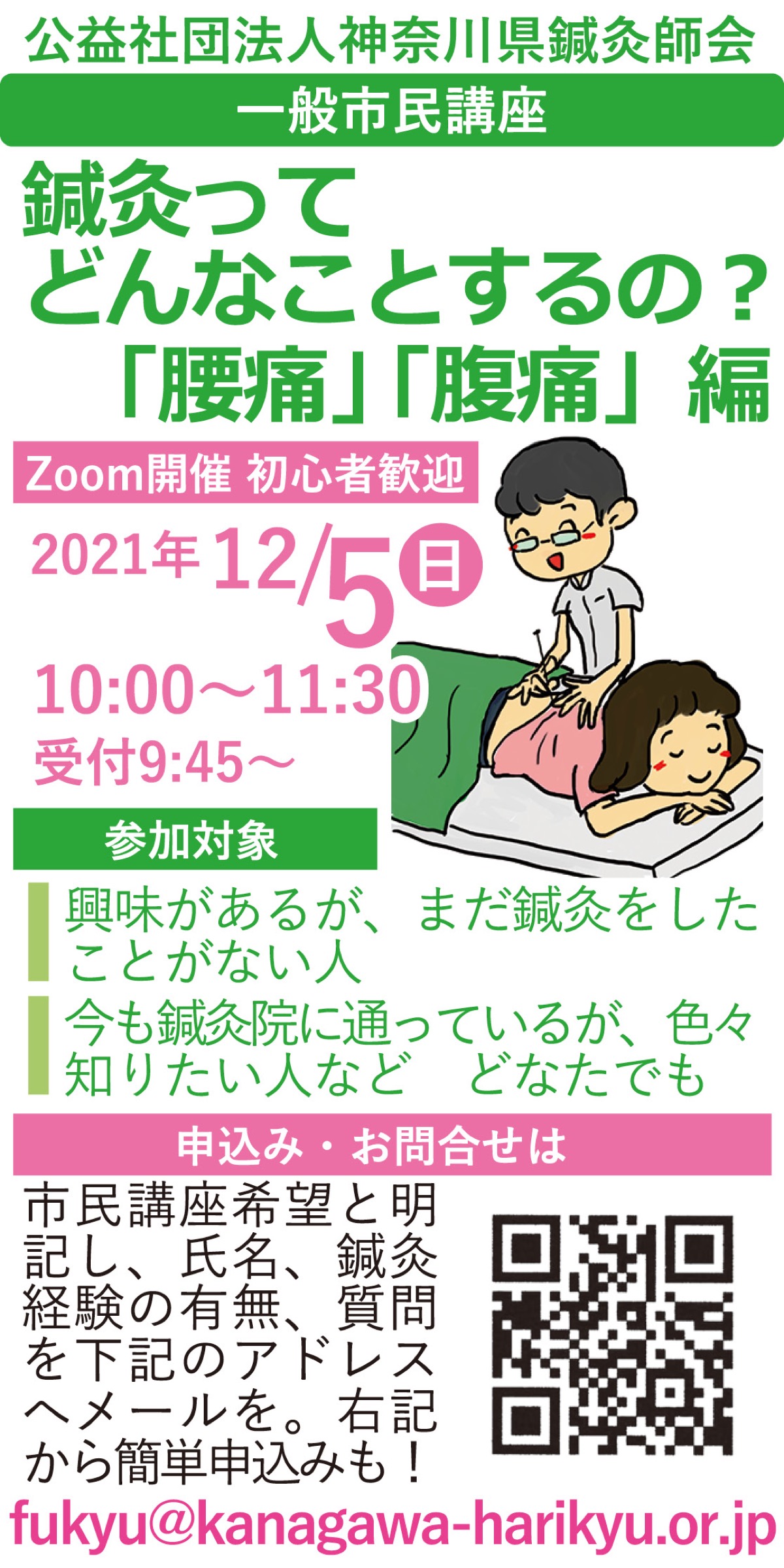 鍼灸に興味があるから詳しく知りたい--。公益社団法人「神奈川県鍼灸師会」が12月5日(日)、市民講座「鍼灸ってどんなことするの?〜腹痛・腰痛編」をオンラインで開催する。現在、参加者を募集中。参加費無料!また先着で無料お試しセット配布。