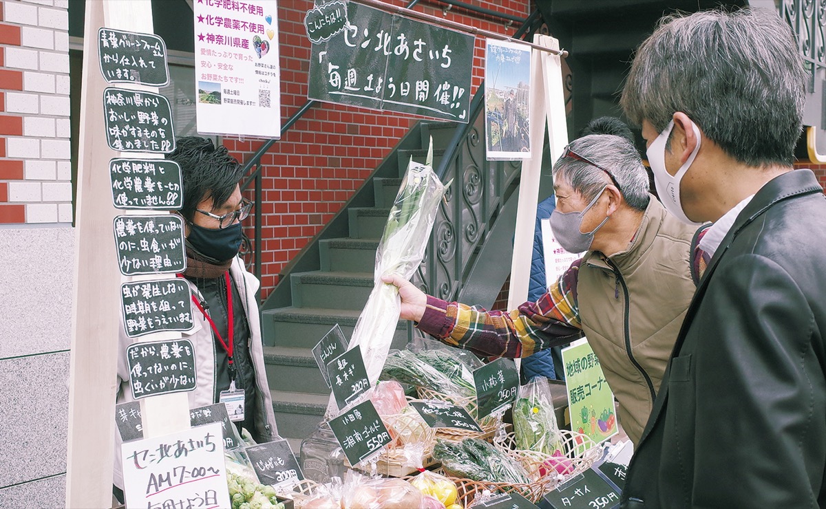 センター北駅近くで毎週土曜日に採れたて野菜の販売を行っている「セン北あさいち」。県内各地の採れたての新鮮野菜を販売するほか、高齢者の見守りの場としての役割を広げている=写真。