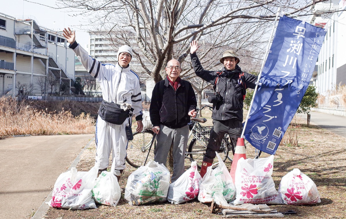 「早渕川ファンクラブ」が早渕川流域の環境美化に取り組み始めて28年。存続危機を乗り越え、毎月2回、早渕川親水広場を中心に清掃を行い、3歳から80歳までが積極的に活動している。