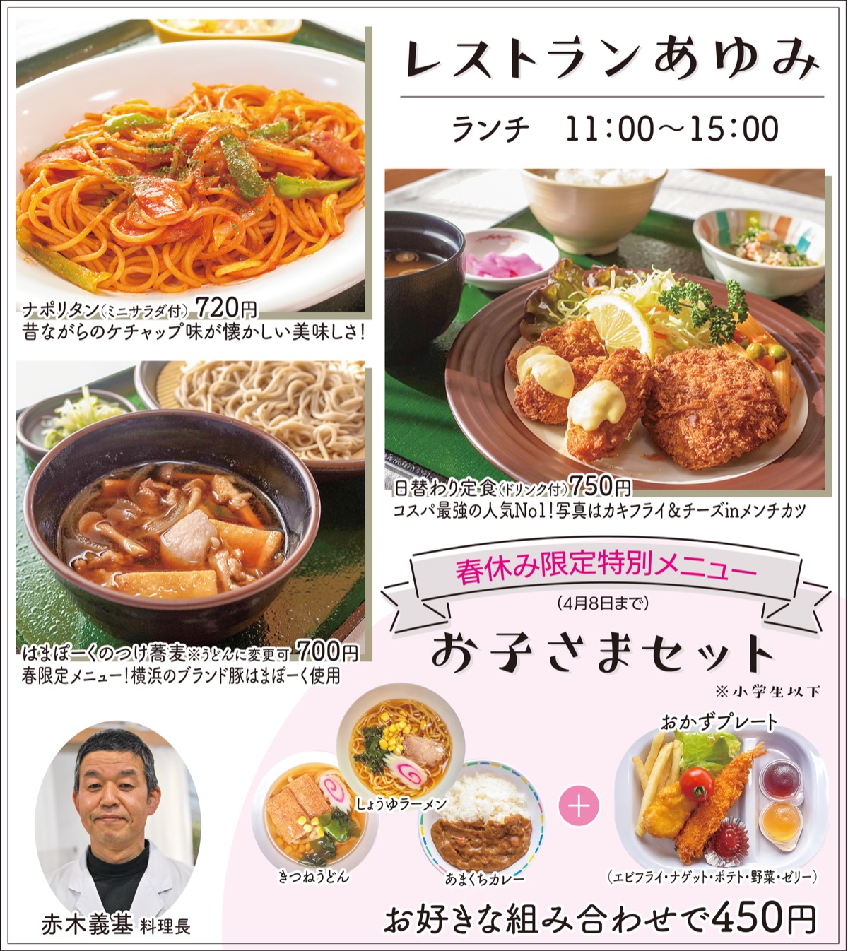 誰もが心休まる憩いの空間、横浜あゆみ荘。地区センターでのサークル帰りやプール後の休憩、友人とのランチなど、まずは気軽にレストランから利用してみるのもいいかもしれない。