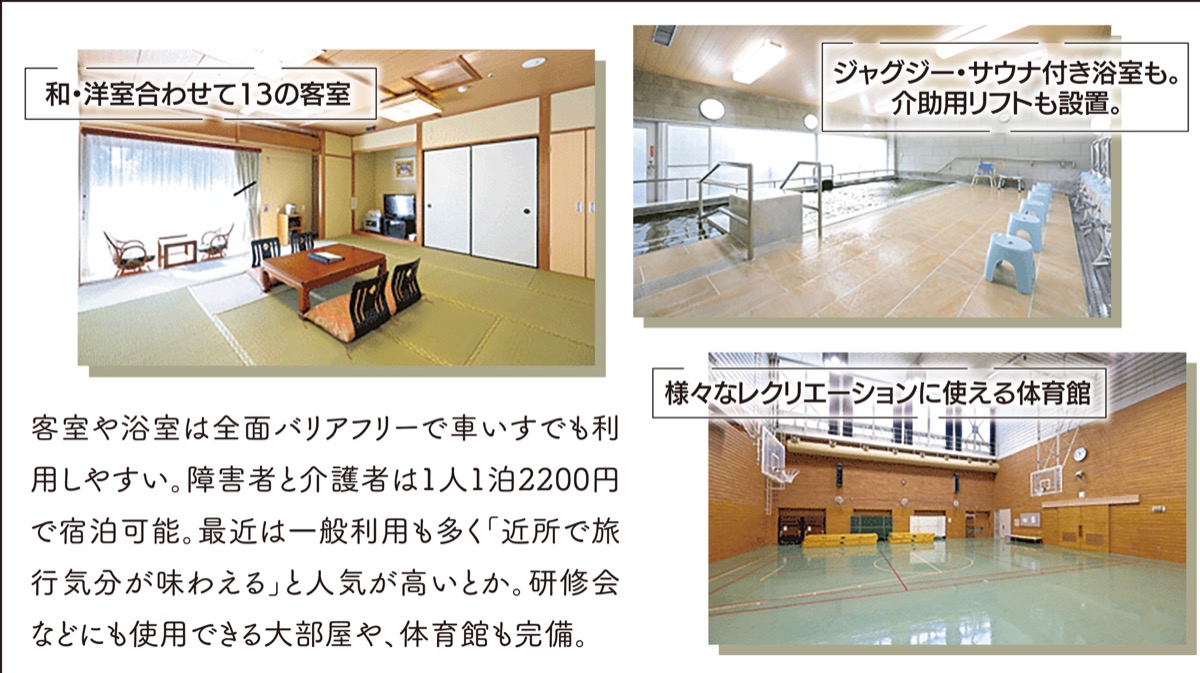 全館バリアフリーで、宿泊用客室のほか研修室や体育館なども完備している同施設。実は障害の有無に関わらず、地域に暮らす誰もがその全ての設備を利用できる。