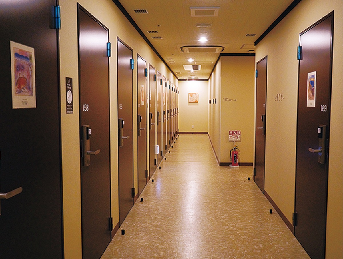 4月13日の昼過ぎ、快活CLUB北山田店にはジャケット姿の人や大きなビジネスバッグを手にした人が次々と訪れ、スマホを手に慣れた手つきで手続きを済ませては個室に向かって行く。鍵付き個室のある一画はホテルのような佇まい。各部屋は1畳ほどの広さでイス席の部屋や横になることもできるフラットな部屋もある。一定程度の防音性があるため、オンラインでの会議や商談も周りを気にせず利用できるのが特徴だ。