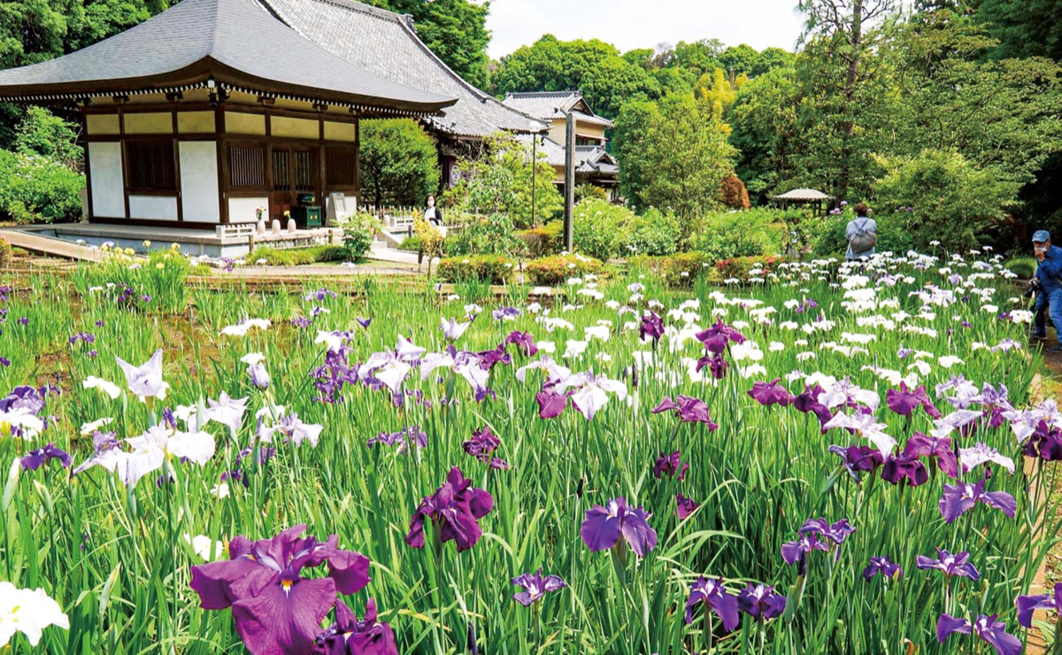 茅ケ崎東の正覚寺(八木廣純住職)で花菖蒲が見ごろを迎え、アジサイとの共演が楽しめる。