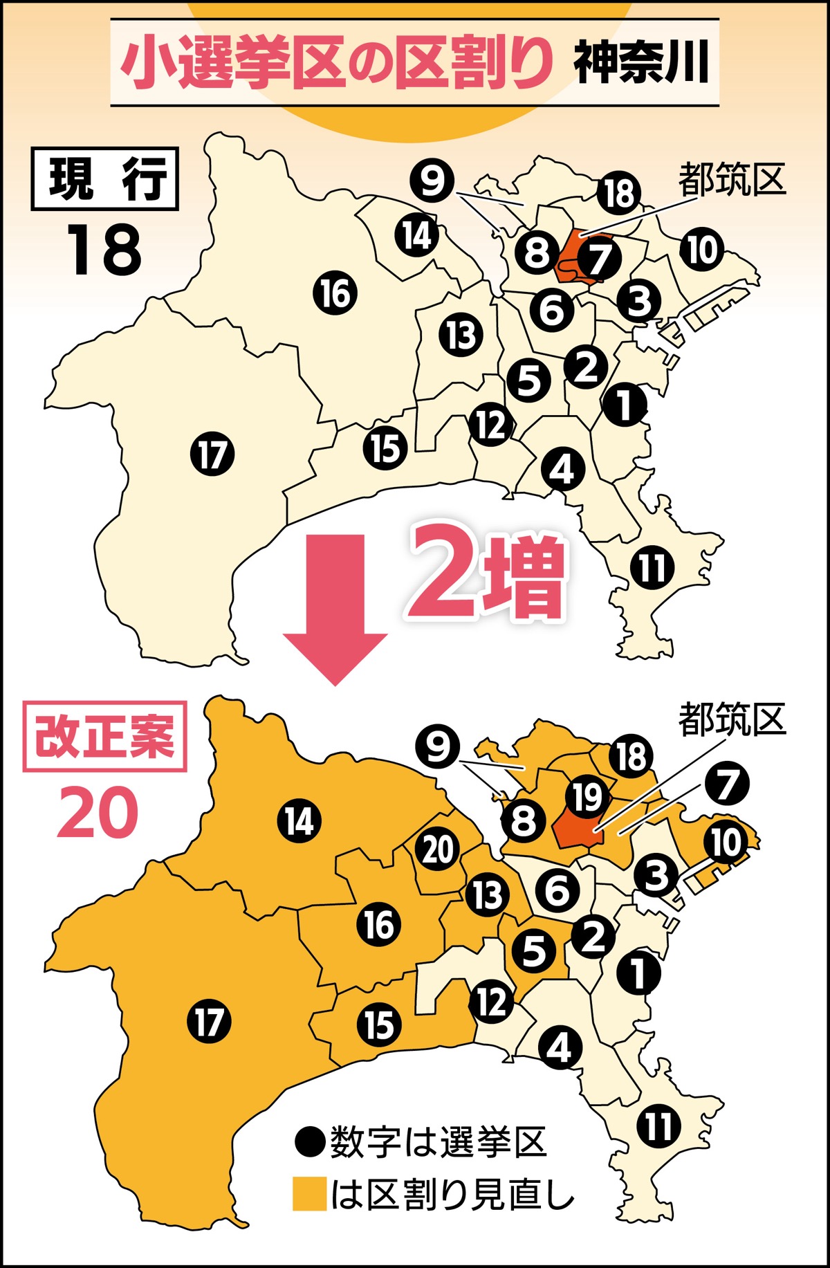 神奈川県内の小選挙区はこれまでの18区から2つ増加し、20区となった。同じ行政区にもかかわず異なる選挙区となっていた分割状態を解消し、11の選挙区で区割りの線引きが変更された。