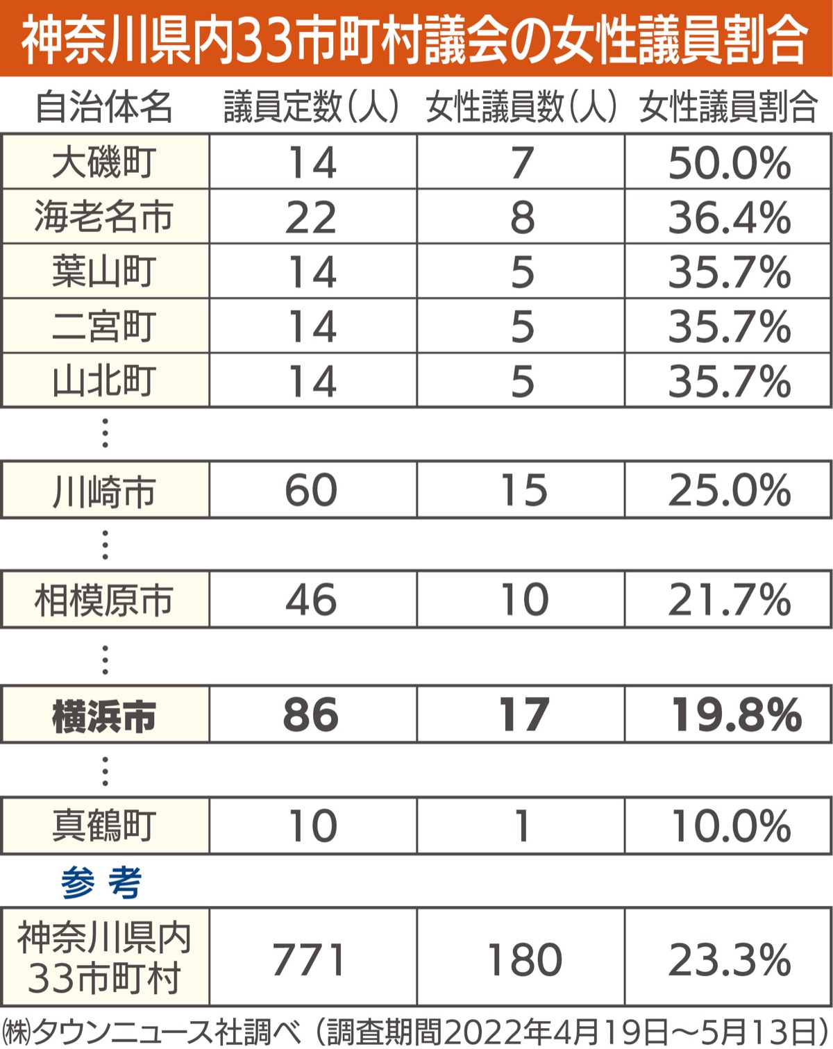 横浜市は議員定数86のうち女性が17人で、女性議員の割合は19・8%だった。県内自治体の議会で女性議員比率が最も高かったのは50・0%の大磯町。以下、海老名市36・4%、葉山町・二宮町・山北町35・7%、逗子市35・3%、鎌倉市34・6%、茅ケ崎市32・1%、綾瀬市30・0%が30%を超えている。