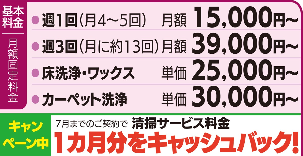 対象は幼児・高齢者施設のほかオフィスやクリニック、小規模商業施設など。フロアやトイレなどの日常清掃のほか、カーペットのドライクリーニングやエアコン・フィルター清掃など定期清掃も幅広く対応。使用頻度に応じてプランをカスタマイズし無駄なコストを省けるのも嬉しい。