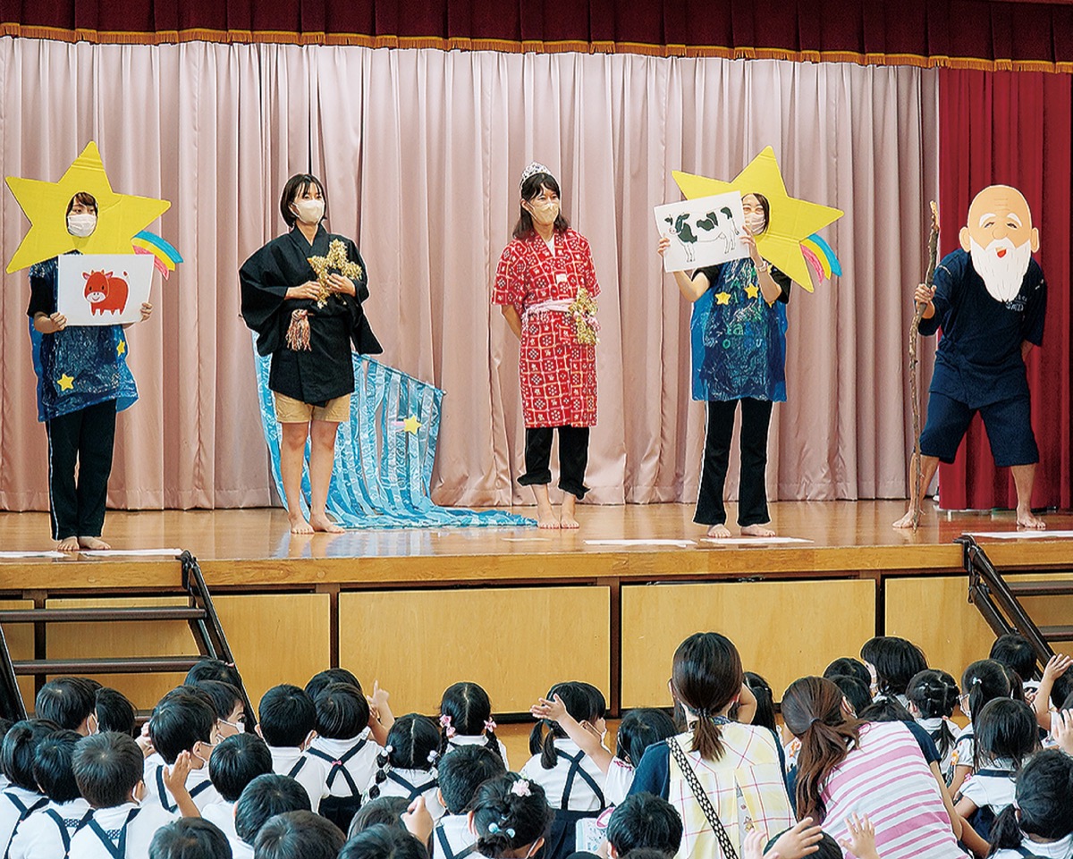 川和町の都筑ヶ丘幼稚園(柏木照正園長)で6日、七夕会が開かれた。教員たちが七夕にちなんだ寸劇を披露し、園内は子どもたちの笑い声が響き、和やかな雰囲気に包まれた=写真。