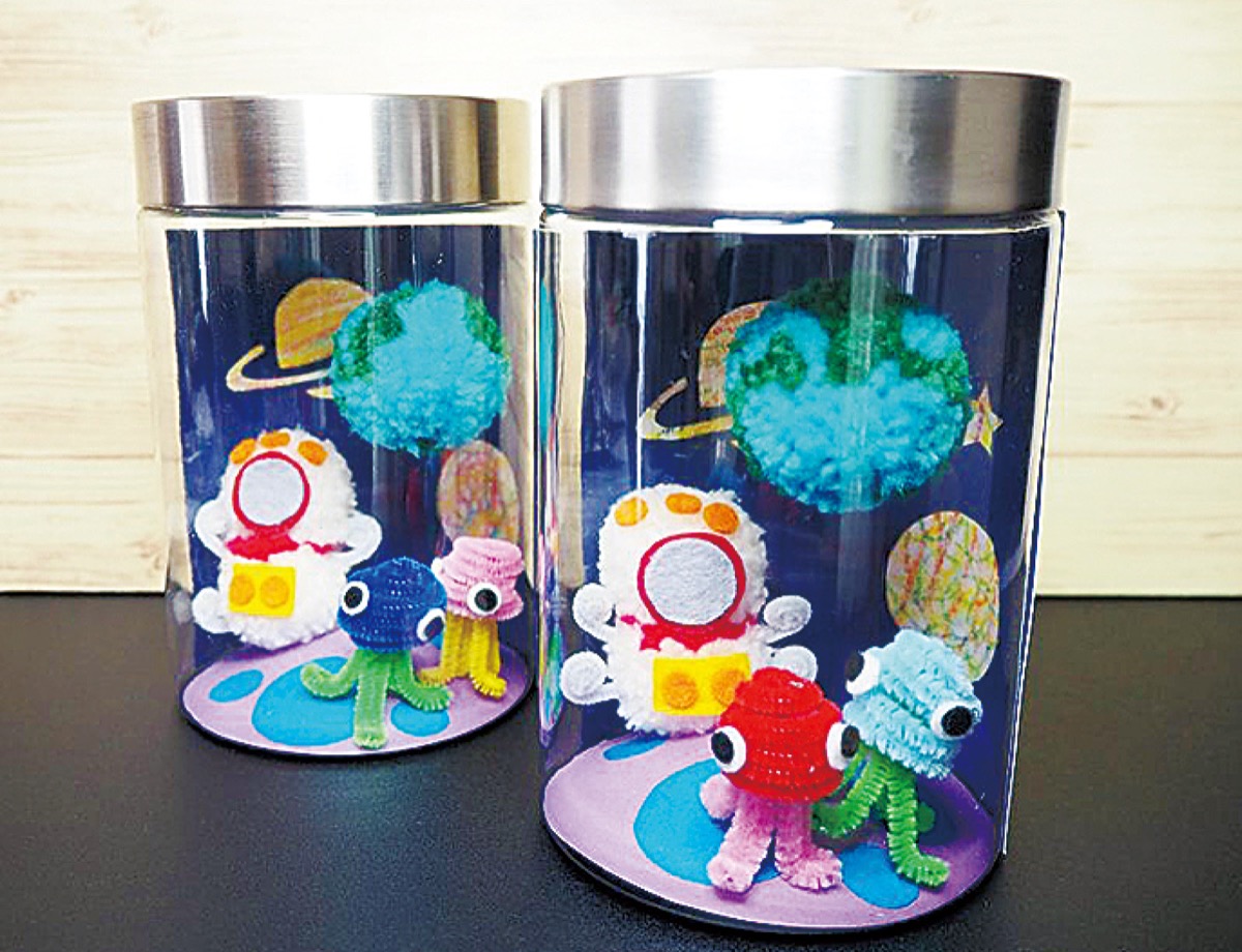 フェルトやモール、画用紙を使って宇宙飛行士や地球、宇宙人などをつくり、絵と一緒に瓶に詰めてオリジナルの「ギャラクシーポット」をつくる。