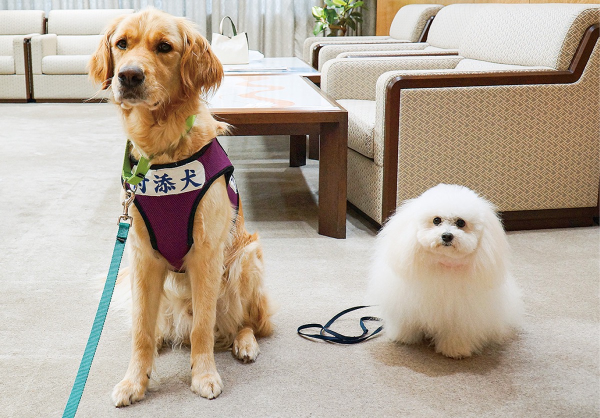 付添犬のキース(ゴールデンレトリバー)とアンジェロ(ボロニーズ)、同NPOのメンバーが7月19日、神奈川県議会の敷田博昭議長と曽我部久美子副議長を訪問し、活動を報告した。