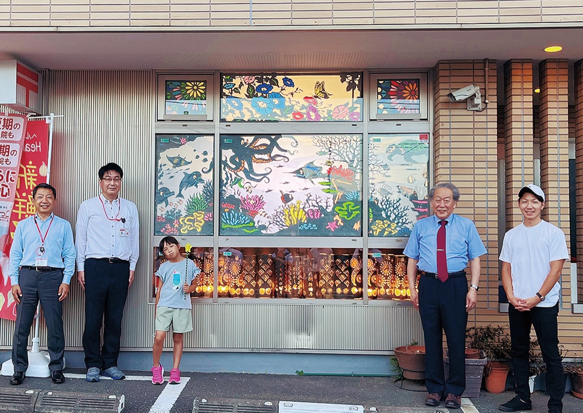 横浜大棚郵便局の窓を幻想的なシャドウアートと竹細工のランプが彩り、道行く人の目を楽しませている。