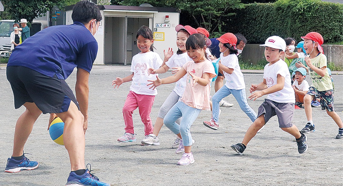 「子どもたちにスポーツの楽しさを伝えたい」と、同じ(福)秀峰会グループである「つくし保育園」2園(都筑区・港南区)で実施。同社とオフィシャルパートナー契約を結ぶ横浜ビー・コルセアーズの森井健太選手とコーチらが参加した。