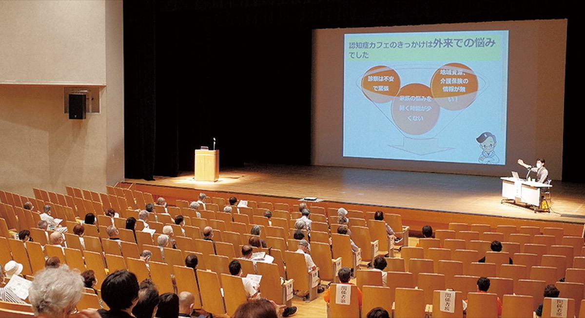 後半は「認知症カフェ」の歴史や役割を説明。現在は国内に推定4000カ所以上のカフェがあることや、認知障害がある患者がカフェを活用して症状が緩和した例を紹介した。