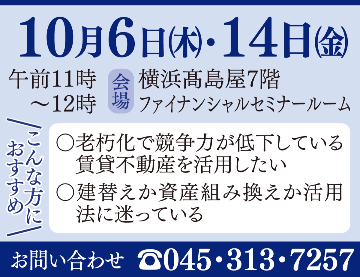 不動産の”ポテンシャル”を引き出す活用手法についての無料セミナーが10月6日(木)と14日(金)、横浜高島屋7階のファイナンシャルセミナールームで開かれる。午前11時から正午まで。