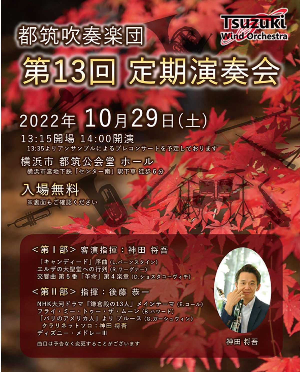 区内を拠点に活動する都筑吹奏楽団の第13回定期演奏会が10月29日(土)、都筑公会堂(都筑区総合庁舎内)で開かれる。午後1時15分開場。2時開演。入場無料(全席自由)。
