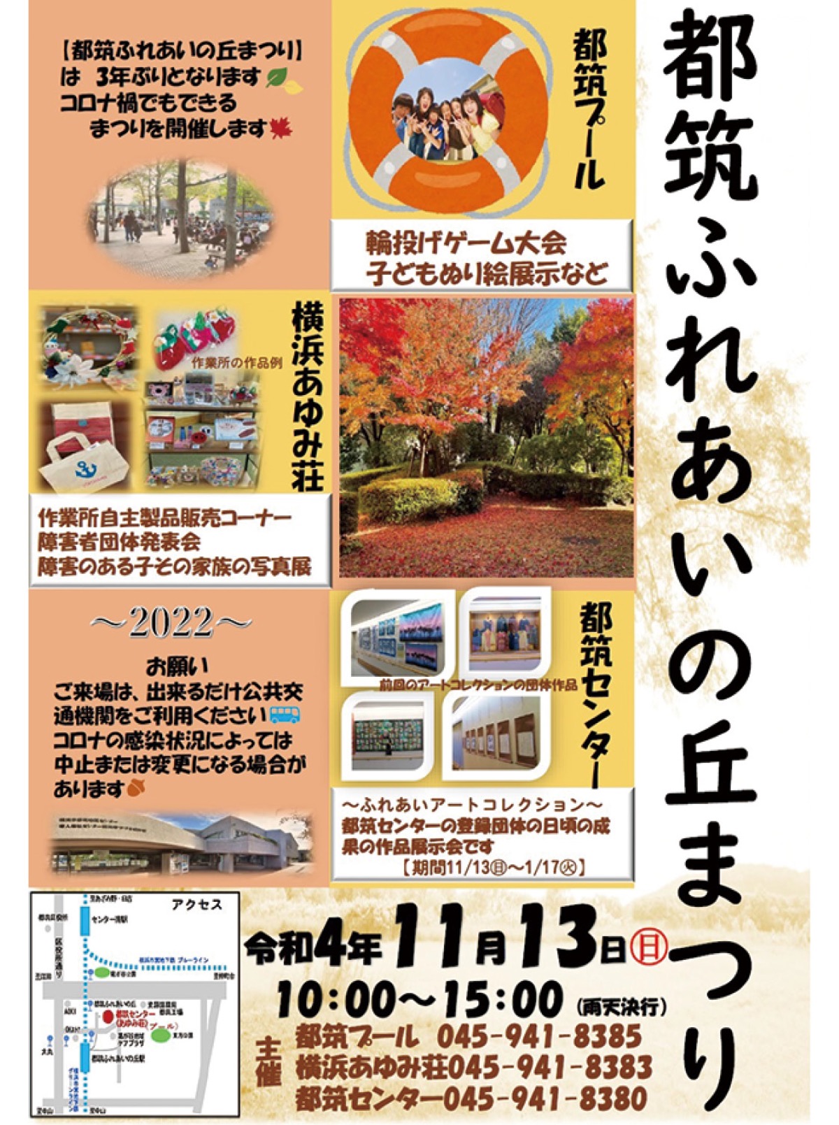 都筑ふれあいの丘まつりが11月13日(日)に開かれる。午前10時から午後3時まで。主催は都筑プール、横浜あゆみ荘、都筑センター。雨天決行。