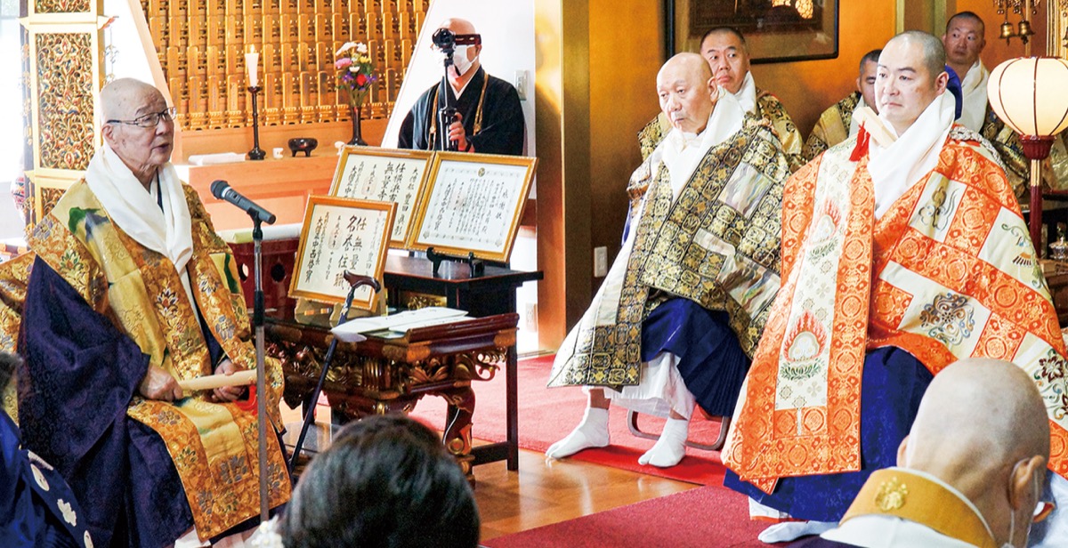 あいさつの席で眞爾名誉住職は「コロナで遅れたけれども、なんとか式ができたことは皆さんのおかげと感謝している。80歳となり、よくここまで生きてこられた。なにもかも檀信徒、世話人の方のおかげ。これからも新住職をお願いします」と話した。
