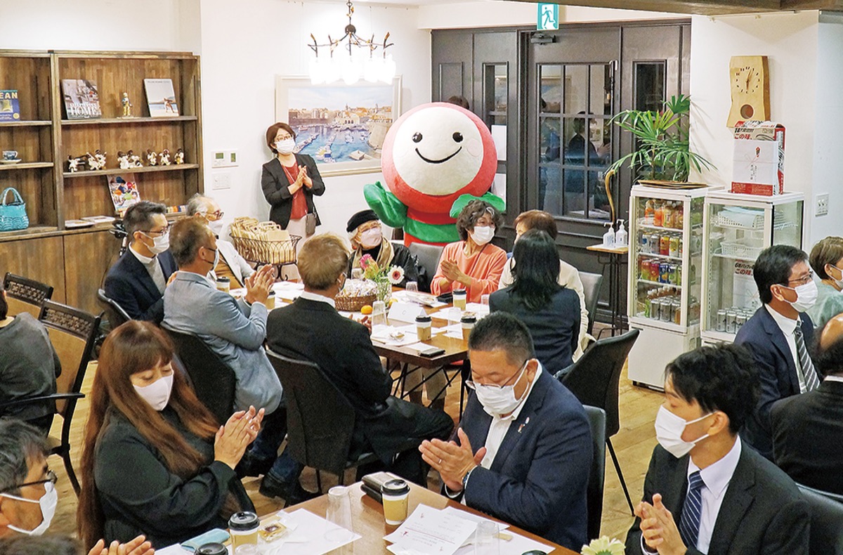 都筑区のマスコットキャラクター「つづきあい」ちゃんを囲んで都筑区の発展を願う有志による集まり「第7回あいちゃん友の会」が10月28日、中川中央のレンタルスペース「ファースト・ムーブ」で開かれた。センター北エリアを中心に区内で企業活動や地域活動に取り組むメンバーら約50人が参加し、親睦を深めた。