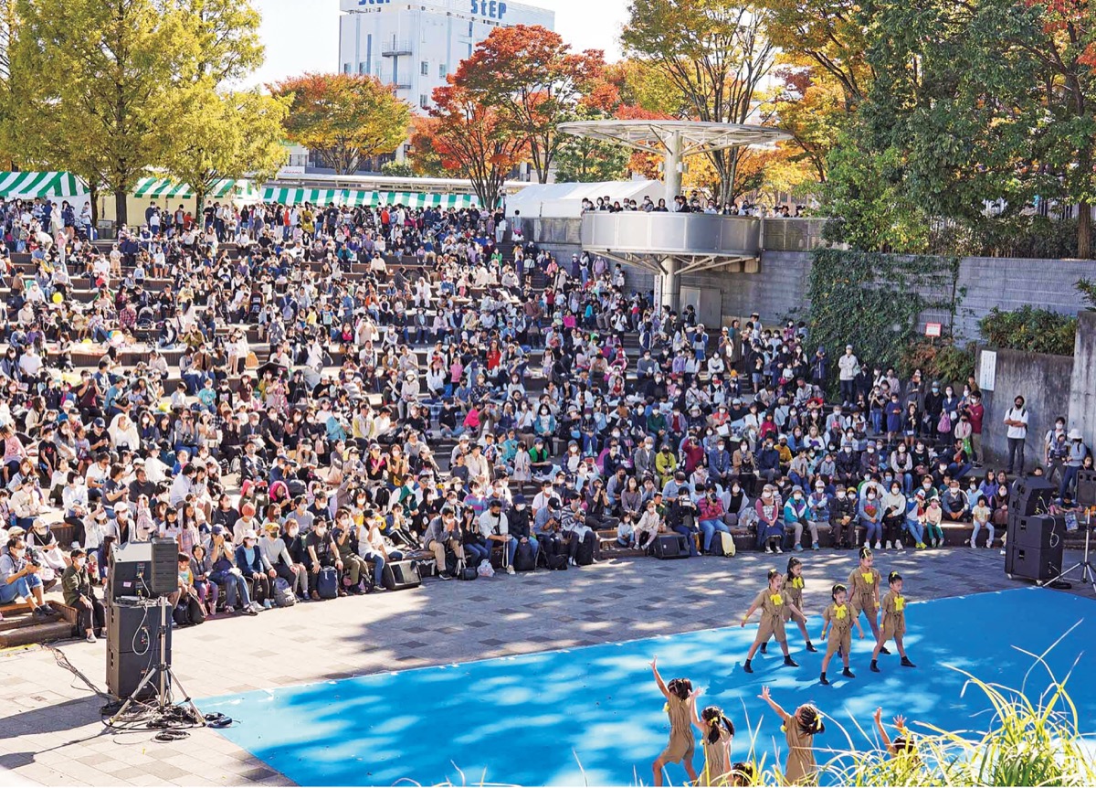 例年はセンター南とセンター北で開催していたが、今回は規模を縮小して開催。駅前のすきっぷ広場には特設ステージが設置され、区内の団体が歌やダンスを披露。町内会自治会による飲食ブースや露店も立ち並び、各所に長蛇の列ができた。