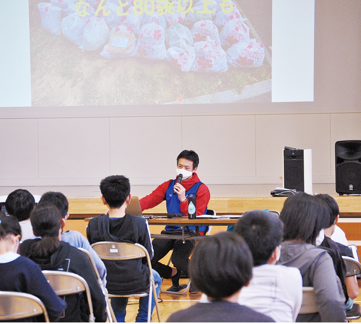 この日は、早渕川流域の環境美化活動を行う同クラブの木村紘大さんが登壇し、クラブの活動や早渕川に生息する生き物を紹介。また町中から川へ飛んでくるゴミの問題や、魚などの体内からも検出されるマイクロプラスチックの危険性を伝えると、児童からはどよめきが上がった。