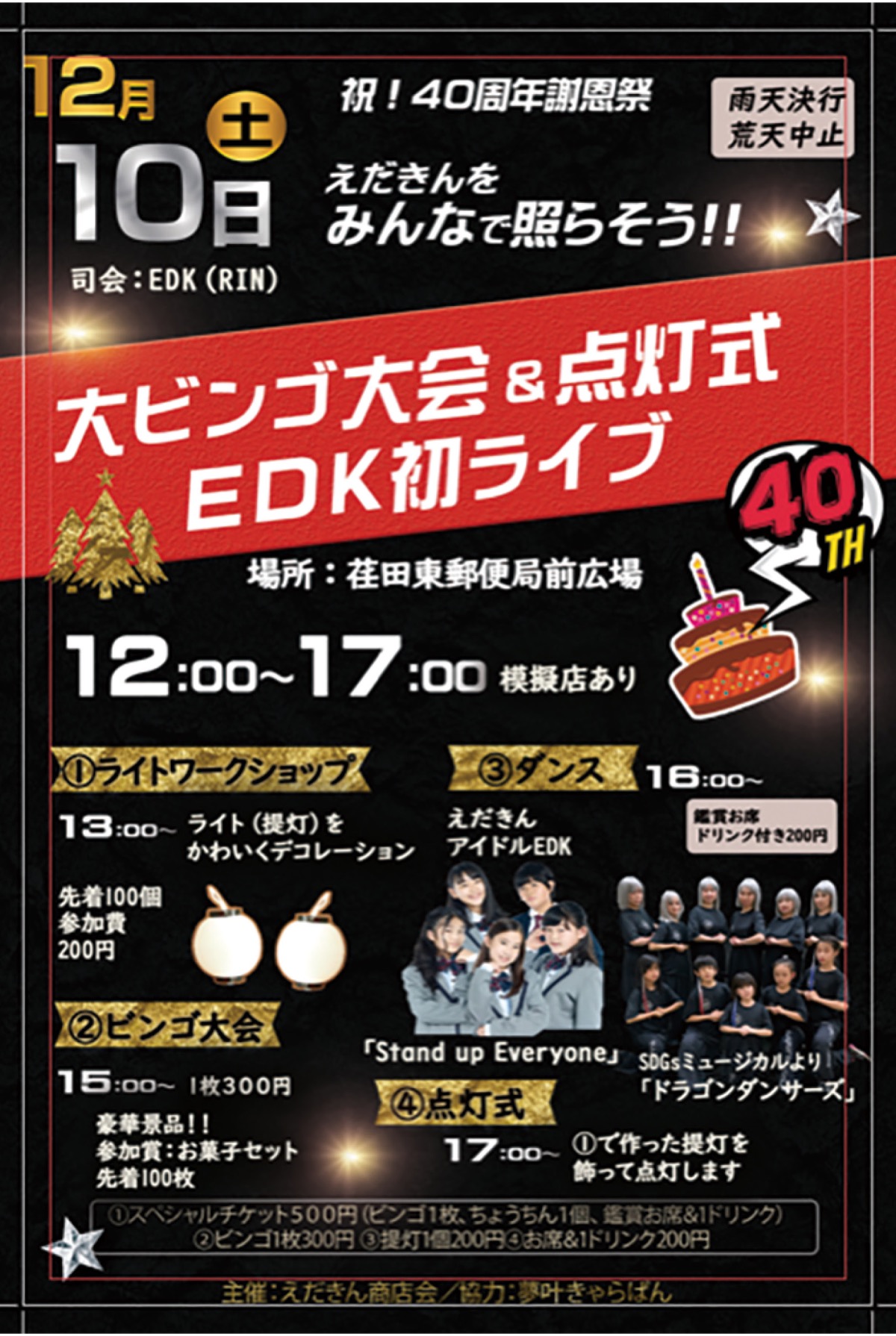 荏田南近隣センター商店街「えだきん商店街」(宮原勇貴会長)の節目を祝うイベント「祝!40周年謝恩祭〜えだきんをみんなで照らそう!大ビンゴ大会&点灯式 EDK初ライブ」が荏田東郵便局前広場で開かれる。港北ニュータウン最古として地域住民に親しまれてきた商店街を地域住民と盛り上げる。