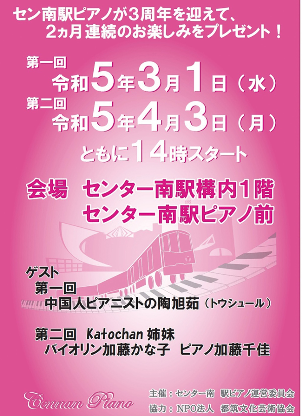 横浜市営地下鉄センター南駅の構内にピアノが設置されてから3周年を記念したイベントが3月1日(水)と4月3日(月)に同所で開かれる。両日とも午後2時スタート。観覧無料。主催はセンター南駅ピアノ運営委員会。協力はNPO法人都筑文化芸術協会。