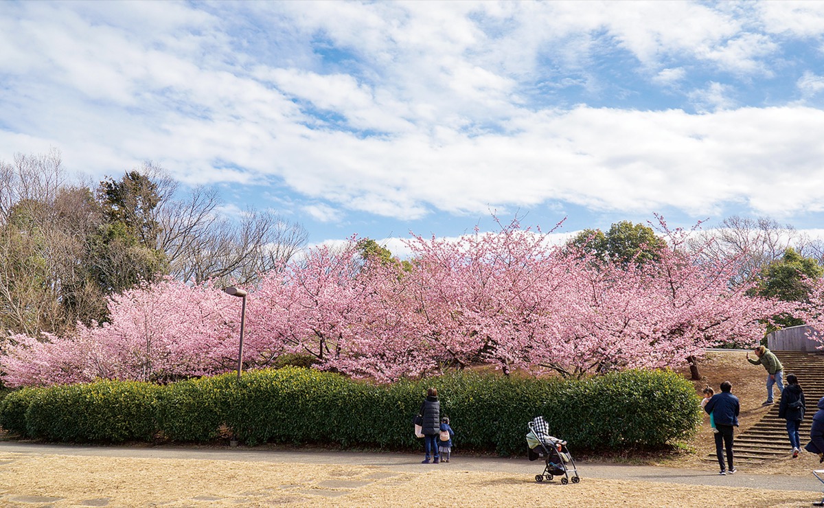 同公園は区内でも屈指の河津桜の名所として知られ、園内の斜面地に30〜40本植えられている。例年、2月下旬に満開を迎える。