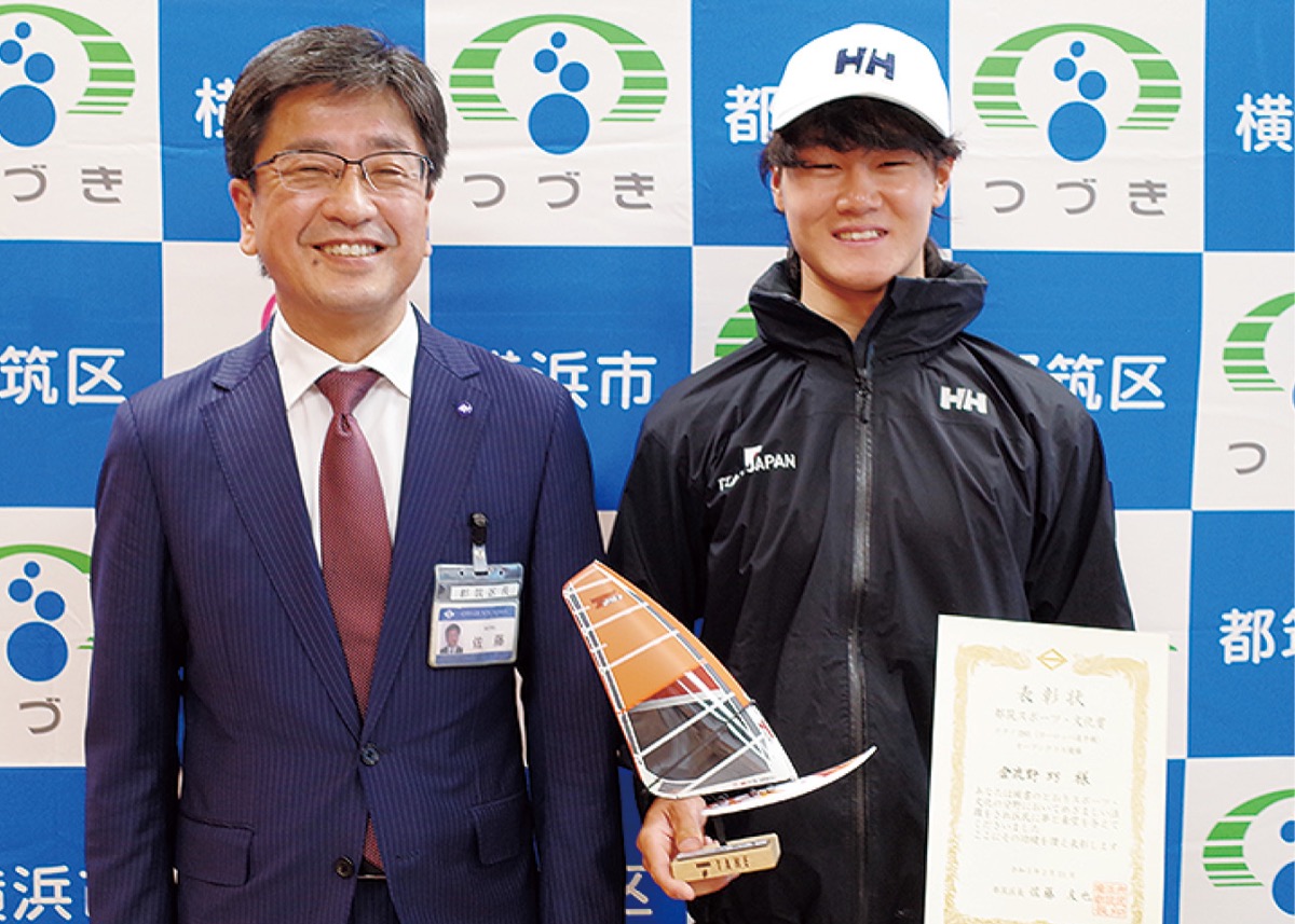 「令和4年度都筑スポーツ・文化賞」を受賞した区内在住の倉鹿野巧さん(ウインドサーフィン)が9日、都筑区役所を訪れ、佐藤友也区長から表彰状を受け取った。