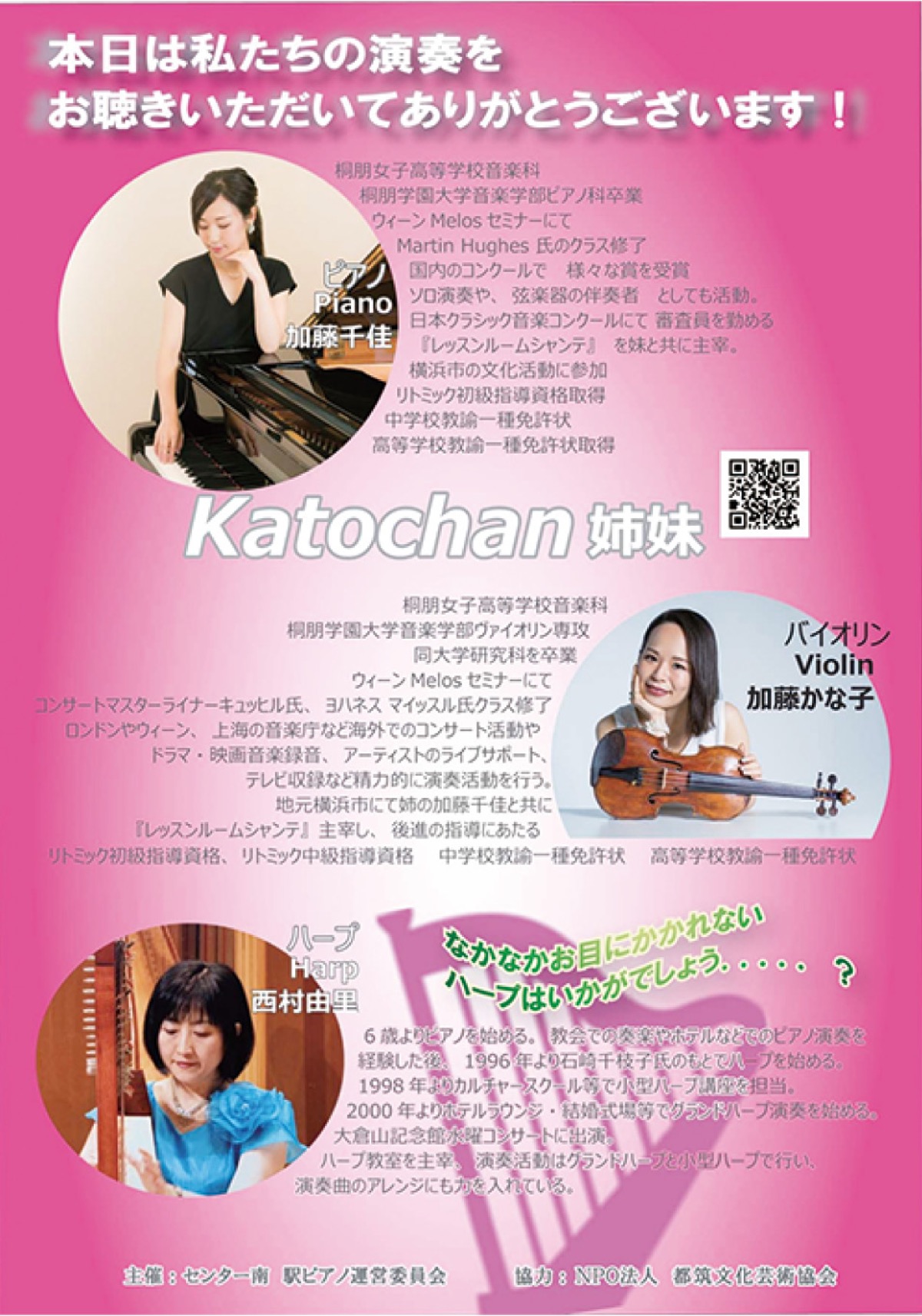 出演はピアノ演奏の加藤千佳さんとバイオリン演奏の加藤かな子さんのKatochan姉妹、ハープ奏者の西村由里さんら。
