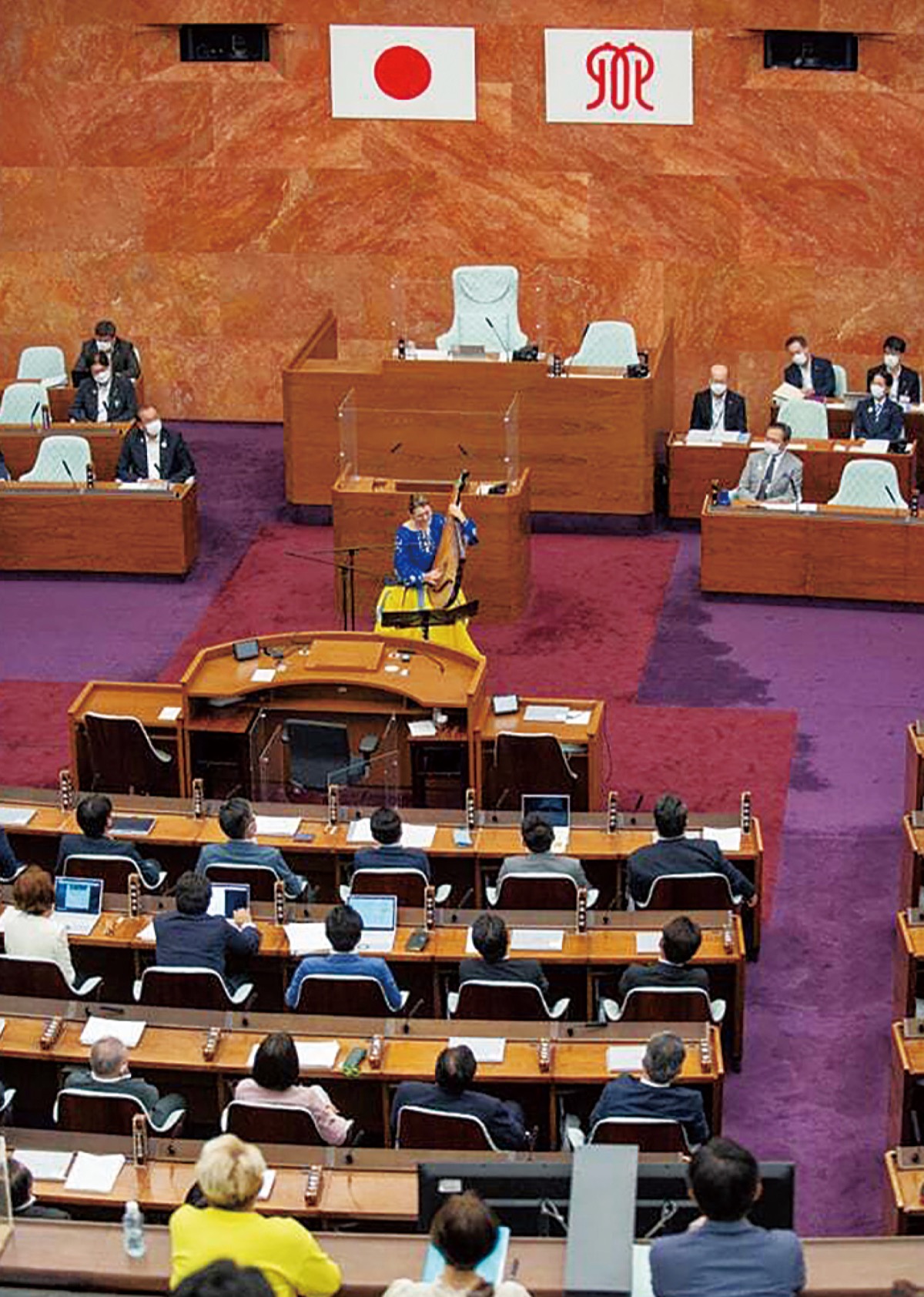 さらに、ロシアによるウクライナ侵略が長期化する中、善良なウクライナ国民に寄り添い、一刻も早く、平和が訪れることを願いつつ、本会議場において、ウクライナから避難されている方々をお迎えし、民族楽器バンドゥーラ演奏会を開催しました。