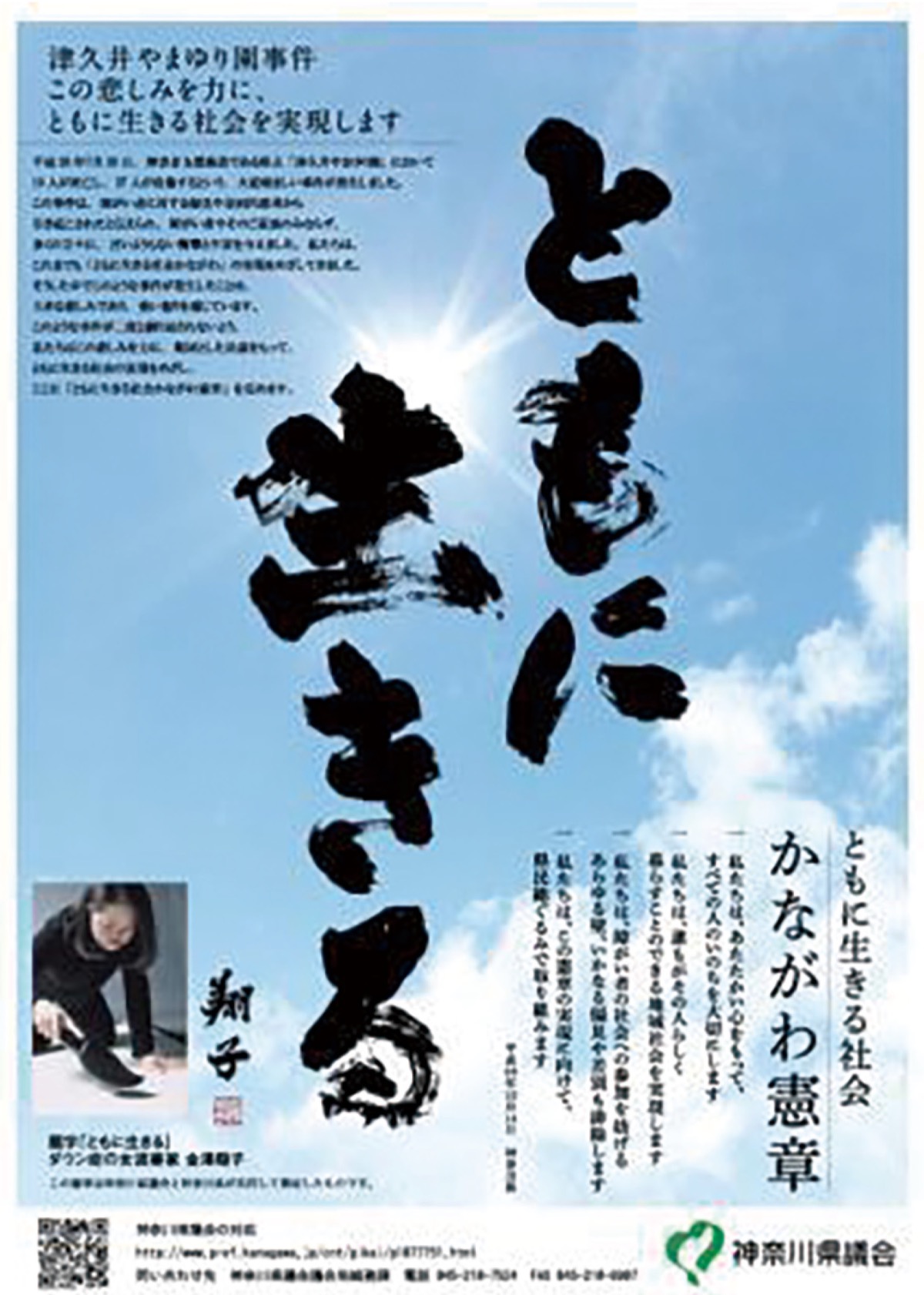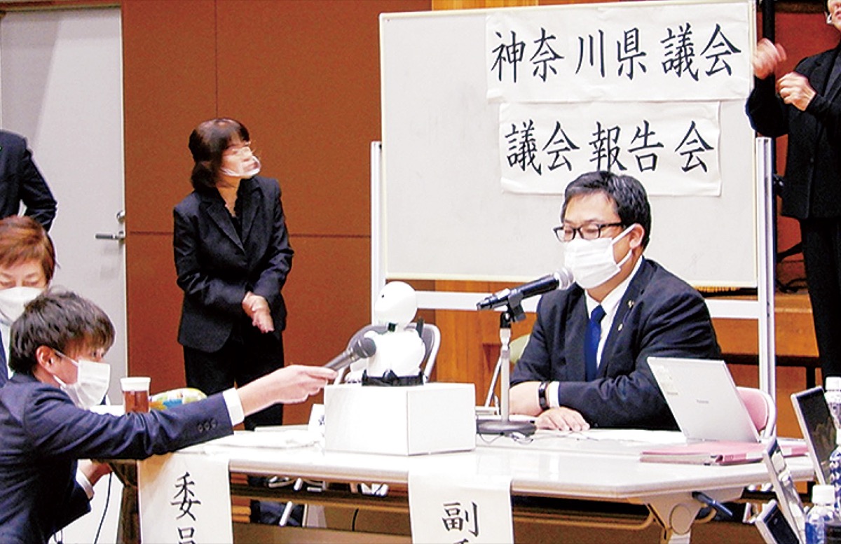 津久井やまゆり園事件発生を受け策定した「ともに生きる社会かながわ憲章」の理念を普及するために各会派代表の議員のご参加のもとチラシ配布を行うとともに、「共生社会の実現」と「開かれた議会の実現」を目指し、津久井やまゆり園において「議会報告会」いわゆる「出前議会」を開催し、会場への参加が難しい障害当事者の方にも、遠隔操作ロボット(OriHime)を通じ、意見交換にご参加いただきました。