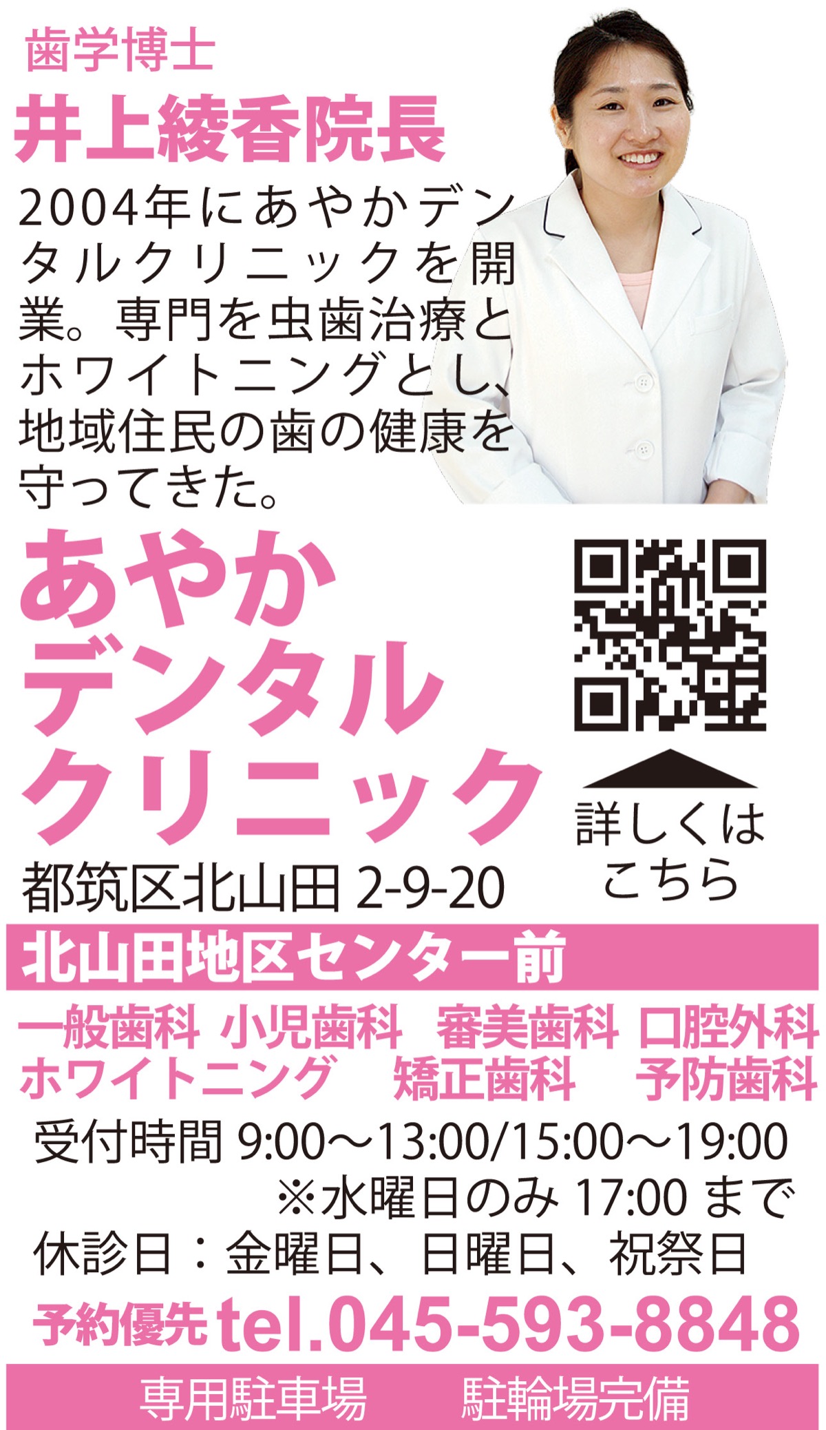 北山田地区をはじめ、地域住民の歯の健康を守っているのが「あやかデンタルクリニック」。井上綾香院長は「なるべく削らない、痛くない、金属を使わない身体に優しい治療を心掛けています」と話す。