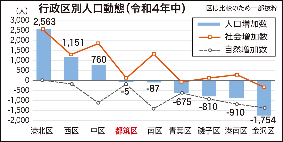 区別にみると、都筑区は社会増減が155人増、自然増減が160人減となり、総人口は5人減に。区担当者は「ここ何年か増加はしていたが、(増加幅は)鈍化傾向にあった。要因はこれから分析していく」と話した。増加から減少に転じた区は都筑区のほか、青葉区、戸塚区、港南区だった。一方、減少から増加に転じたのは西区と中区だった。