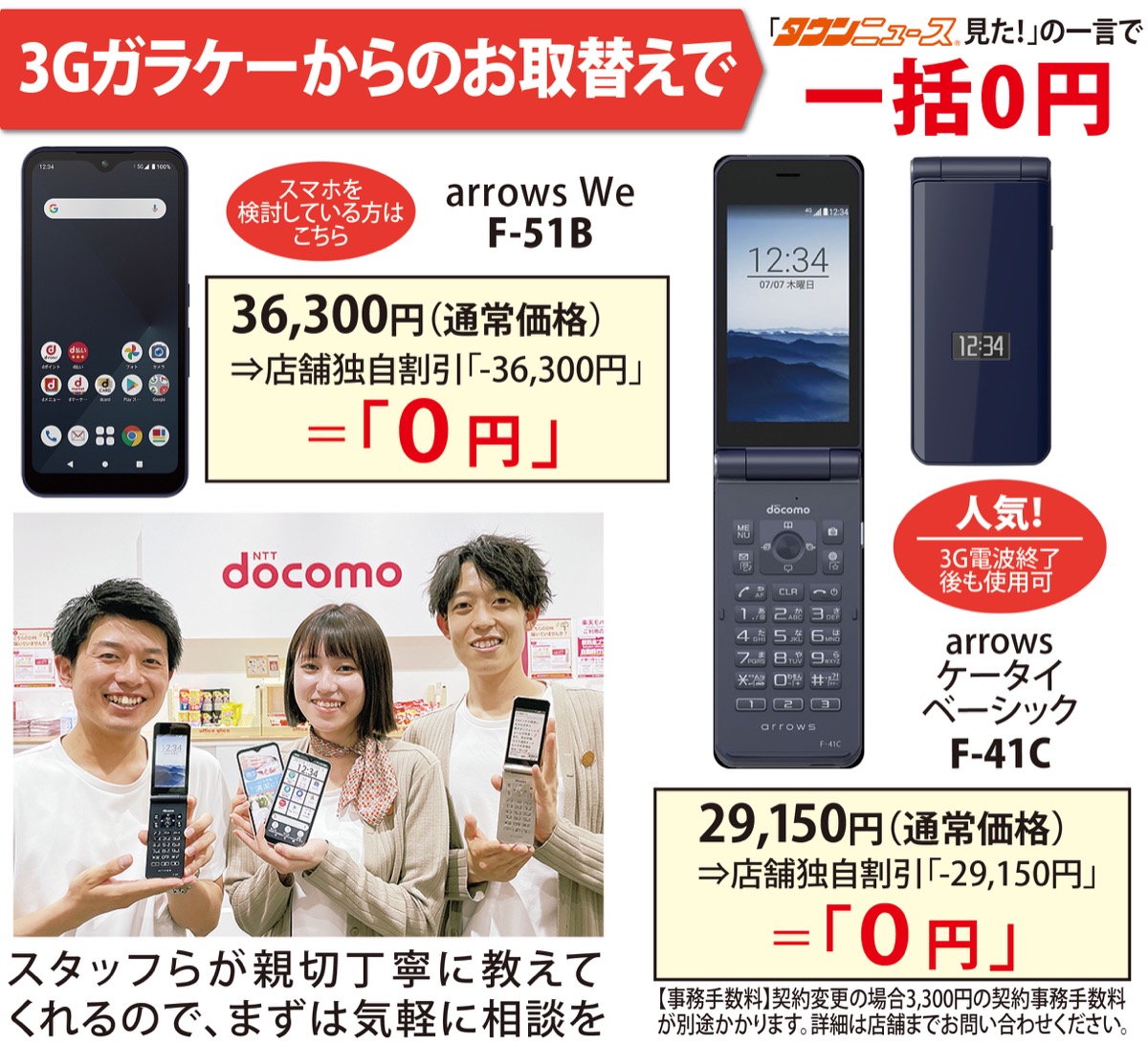 従来の携帯電話(ガラケー)を利用している人へ緊急速報!FOMAプラスエリアが順次終了を迎え、都筑区内でも多くのエリアで機種によっては利用ができなくなる。この機に機種の乗り換えを検討している人には『ドコモショップ』がオススメ。新横浜駅前店では、ガラケーからの機種変更をする際に、「タウンニュースを見た」で3G電波終了後も使える折り畳み携帯など、人気のスマホ=写真=が”0円”になるキャンペーンを実施中(各台限定10台)。好評につき、早めの連絡を。