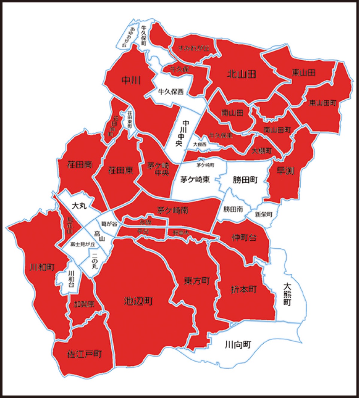 5月以降の都筑区内のFOMAプラス非対応エリアは、地図上の赤い地域。同店では、機種選びの相談は当然、スマホ教室等で購入後のサポートも充実。「対象エリアで2つ折りケータイをお使いの方は当店まで」