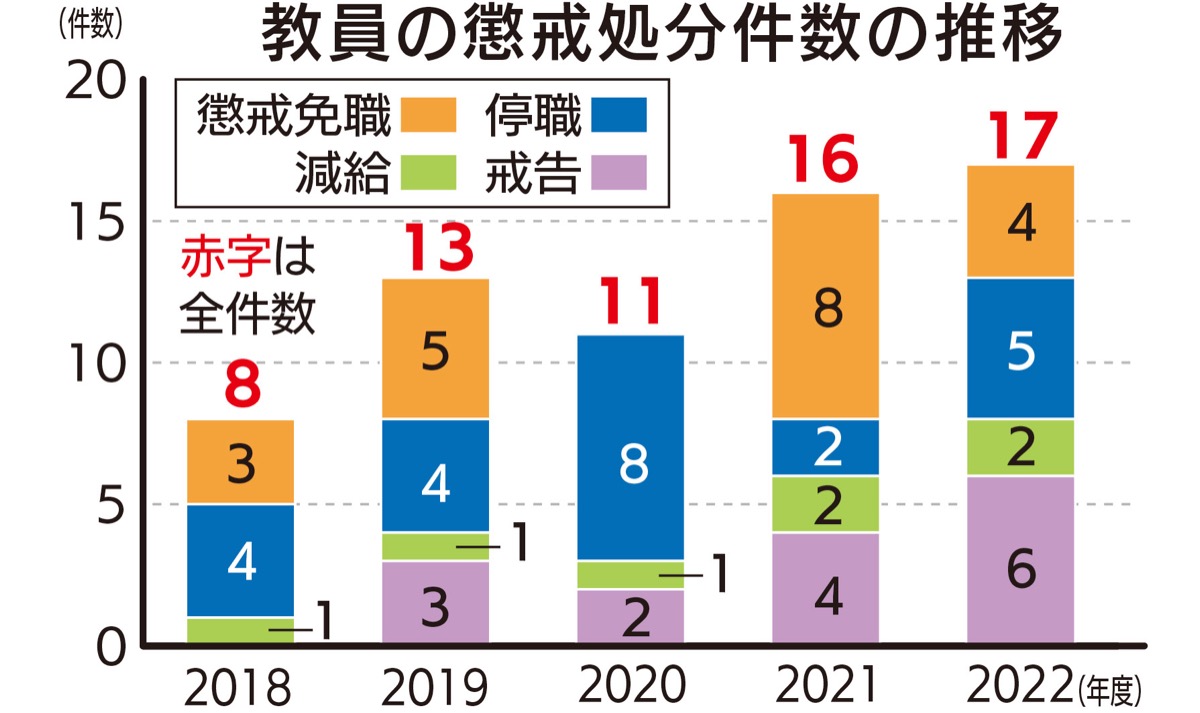 年度ごとの処分件数を見ると22年度17件、21年度16件、20年度11件、19年度13件、18年度8件。処分理由別に見ると、この間の最多はわいせつで18件。セクハラ9件、不適切な指導8件、窃盗7件、体罰6件と続いた。