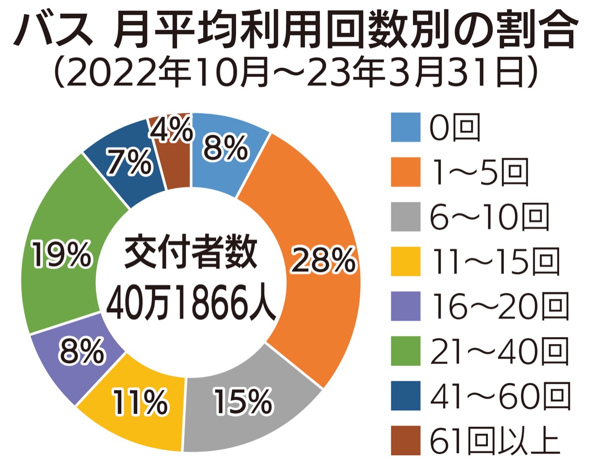市がバス事業者への負担金支払いの積算根拠とする月平均利用回数は15・5回で、実績値と大差はなかった。一方、過去のアンケートなどからは20〜25回の利用が想定されており、市担当者は「コロナの影響や季節性もあり、実態を反映しているとは捉えていない」と話す。引き続きデータ収集を行う方針だ。