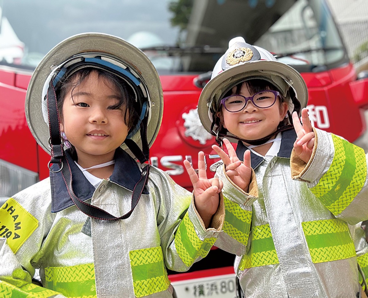 川和消防出張所の消防職員が6月26日、都筑ヶ丘幼稚園=川和町=を訪れ消防体験会を行った。消防車が園の駐車場にやってくると、その姿に園児は大興奮。消防車に乗ったり、消防服を着て記念撮影をするなどして楽しんだ。園のホールでは、消防職員が災害時対応の仕方をパネルクイズで出題。分かりやすく説明した。